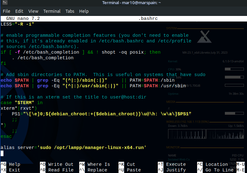 Para crear un alias en linux se hace desde un archivo oculto en la carpeta de usuario ~/.bashrc. Los archivos que empizan por '.' en linux están ocultos. En el navegador de archivos (depende del navegador hay formas de verlos, incluso con un atajo de teclado). Lo más fácil es desde la terminal: