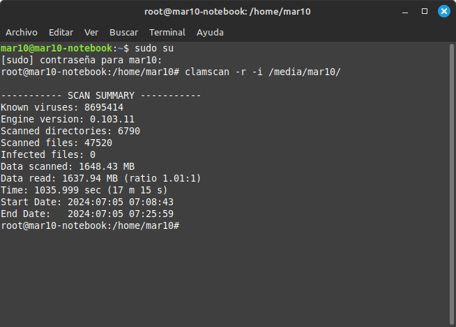 Después podemos hacer un clamscan -r /home --infected --remove=yes
