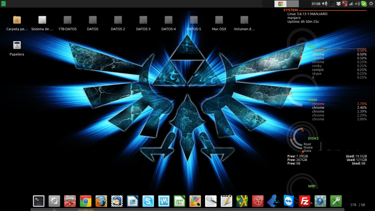 La proxima vez que iniciemos nuestro sistema ya tendremos conky corriendo perfectamente como en esta captura, eso si para ejectutarlo antes de reiniciar, pulsamos ALT+F2 y tecleamos: inicio-conky.